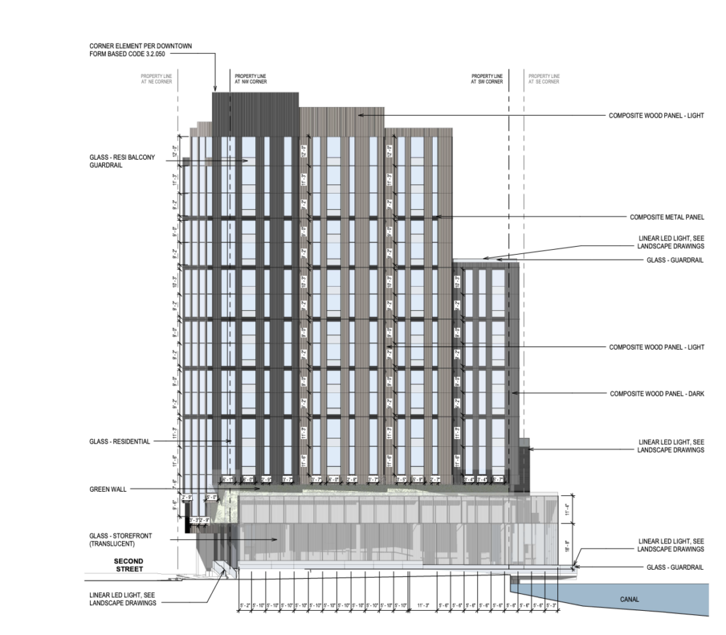 The Project would demolish the existing 4-story vacant office building. The new building will be 180 feet tall and include 5,000 square feet of commercial space.The applicant will use the State Density Bonus Law to achieve the proposed height and density. The Project also includes an exterior boardwalk that allows the public pedestrian access from the intersection of Second and Irwin to and along San Rafael Canal.