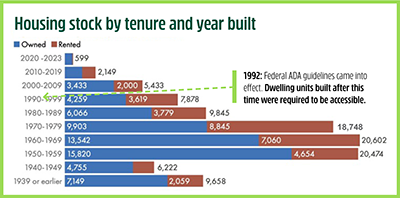 The bulk of Marin’s housing was built from 1942 to 1979, long before California’s accessibility standards were first adopted in the 1980s and the ADA regulations became effective nationally in 1992. Only 1.2% of current housing stock in Marin was built during this century, and because most of the housing is single family homes – which are exempt from ADA standards – this means that today, less than 1% of all housing in Marin is accessible. To make things worse, Marin has the lowest housing production rate in the greater Bay Area.