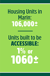 Although California’s accessible building codes are more progressive than the national ADA, Marin remains inaccessible to many. ADA and state regulations cannot always be applied to already existing structures, and new housing is not built fast enough for there to be a significant number of new fully accessible homes. Also, Accessory Dwelling Units (ADUs) and Junior Accessory Dwelling Units (JADUs) are not required to be fully compliant with ADA and California standards. So even though ADUs are widely accepted in Marin as a viable pathway to build more affordable housing, people with disabilities are still excluded.