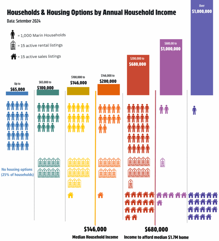 The graphics below show the disconnect between incomes and cost of housing, and how that impacts Marin’s housing market. HOUSEHOLDS AND HOUSING OPTIONS BY ANNUAL HOUSING INCOME shows the distribution of available housing options across incomes. If you make less than $200,000 in annual income, very few housing options are available to you. In a healthy housing market, we’d have 30% more rental units and 10X as much housing available to purchase in the $146-$200K range. Note, there are ZERO housing options for households that make $65,000/year or less. These households are at tremendous risk of becoming homeless or being forced out of Marin if they lose their housing.