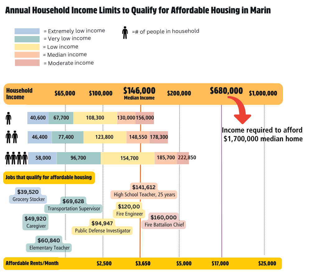 Housing that is “affordable” in and of itself refers to deed-restricted housing that can only be rented or sold to individuals who meet specific income requirements, that are tied to an area’s Average Median Income (AMI). Because of the high cost of living and housing in Marin County in 2025, for a 4-person household, the Average Median Income is a whopping $185,700.